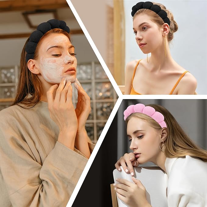 - [Soft & Comfortable] The spa headband hairband is made of high-quality sponge and terry cloth fabric, the sponge lining makes it extremely soft, cushy, and intimate to your skin. The spa headband for women are functional for washing face, makeup, mask routine, yoga, taking shower, birthday spa party and sleepover party.