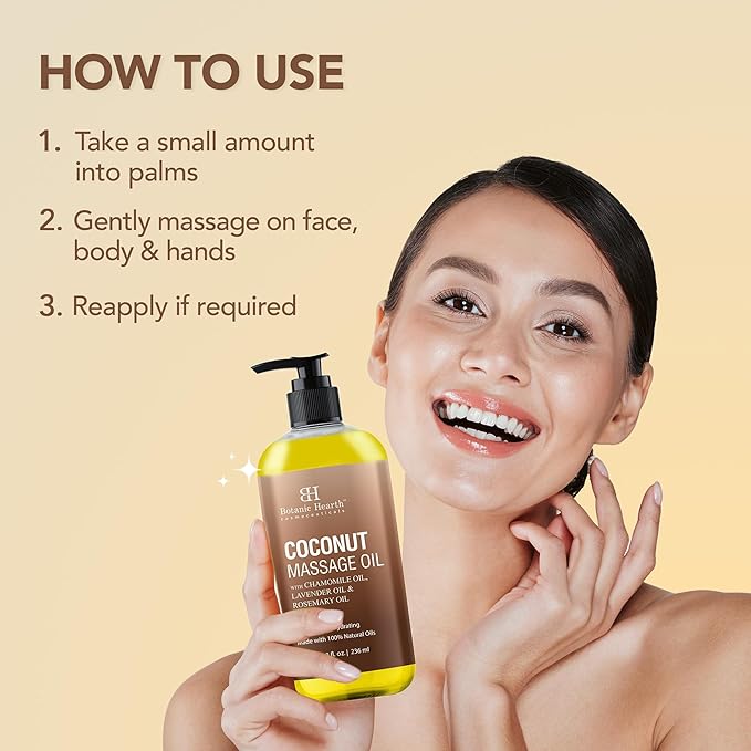 - Natural Massage Oil – Botanic Hearth Coconut Massage Oil is formulated with skin loving ingredients to promote smooth, supple, and soft skin. It contains No Harmful Chemicals and can be used by Men & Women