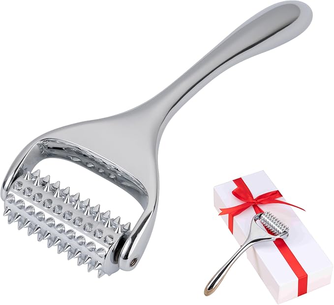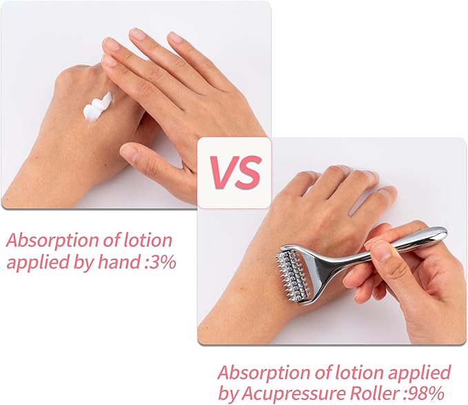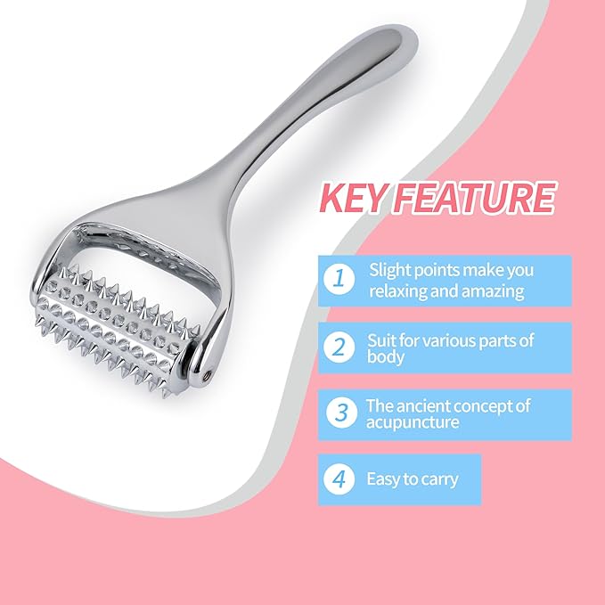 - ♥【Comprehensive Relaxation with Stainless Steel Acupuncture Roller】Experience the ultimate relaxation with our stainless steel acupuncture roller. Designed to alleviate tension and improve circulation, this versatile roller can be used on your face, neck, arms, legs, and even feet. Its 100 mini trigger points gently stimulate pressure points, providing a soothing massage that helps relieve muscle stiffness and promotes blood flow. The ergonomic design ensures that the roller fits comfortably in your hand. Whether you're looking to relax after a long day or enhance your skincare routine, acupuncture roller is a must-have tool for anyone seeking natural pain relief and improved skin health.