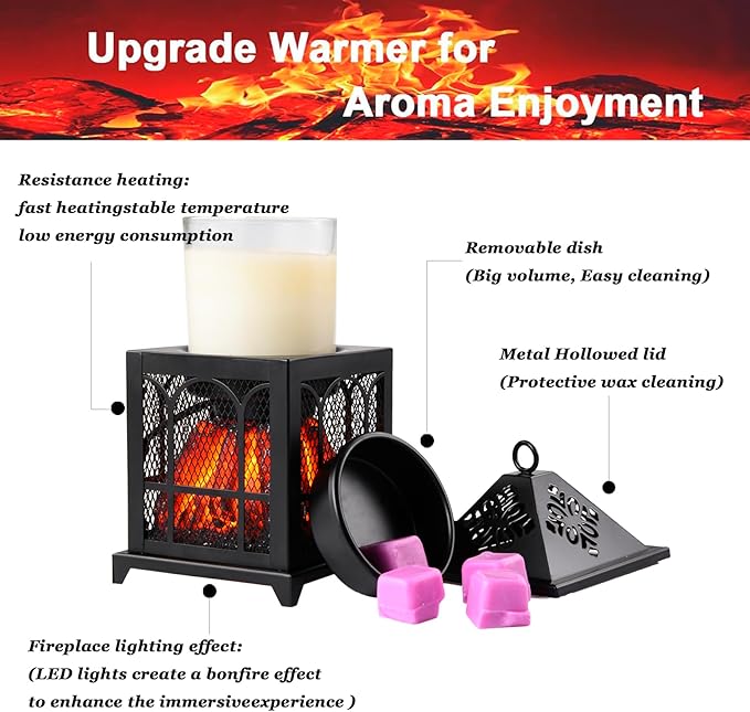 - ✅【Unique Design】This metal wax warmer is PCBA+LED, consisting of a metal frame and a window pattern, and the wax tray is made of Teflon technology, which is resistant to high temperatures and corrosion,The color and ambience of a realistic charcoal fireplace sets your room apart