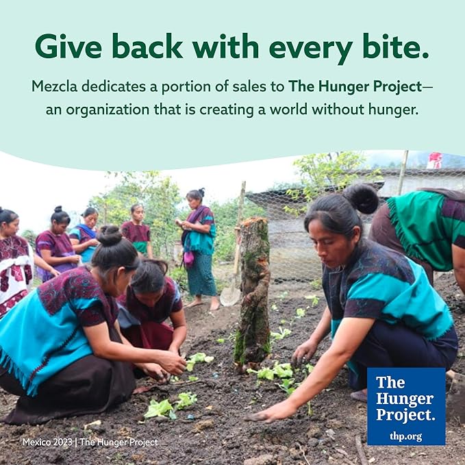 - EACH BAR GIVES BACK: Mezcla is dedicated to making a positive impact in communities around the world. Partnering with The Hunger Project, a global non-profit committed to ending world hunger by 2030, Mezcla donates a proceed of bar sales to support their efforts.