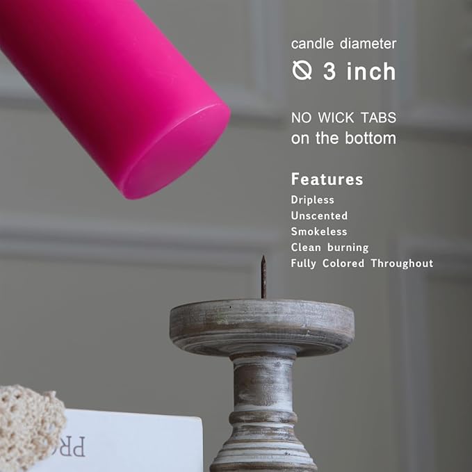 MOZEAL 3" x 6" Hand-Poured Unscented Candle, Dripless Pillar Candle Set of 3, Long Lasting Burning, Approx 120 Hours Burn Time, Rustic Country Style, for Spring Celebrations, Vibrant Energy, Hot Pink