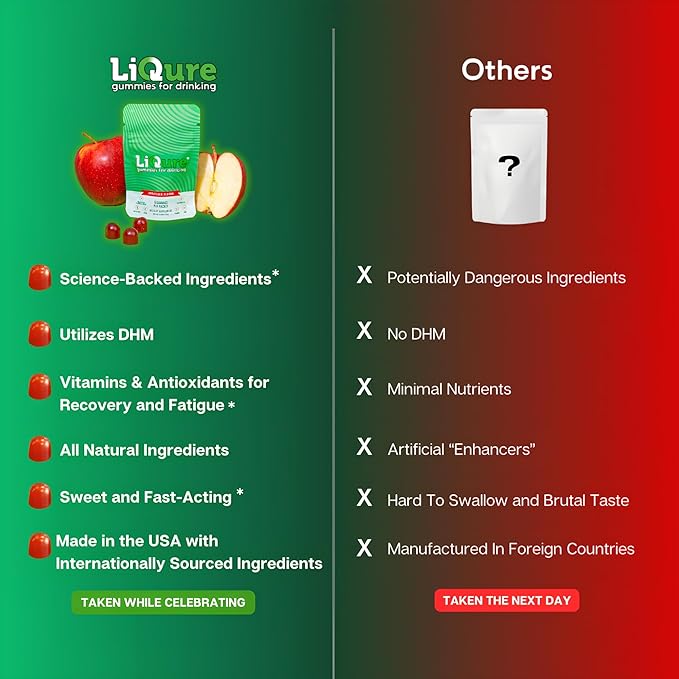 - FOR THE HARD WORKER: LiQure's Gummies for Drinking are meticulously crafted to support the active, on-the-go lifestyle of working professionals, all in a convenient packet. Our science-formulated proprietary blend aids in efficient recovery, ensuring you wake up feeling refreshed and ready to tackle your day with vigor. Perfect for those who wish to balance work and happy hour without compromise.