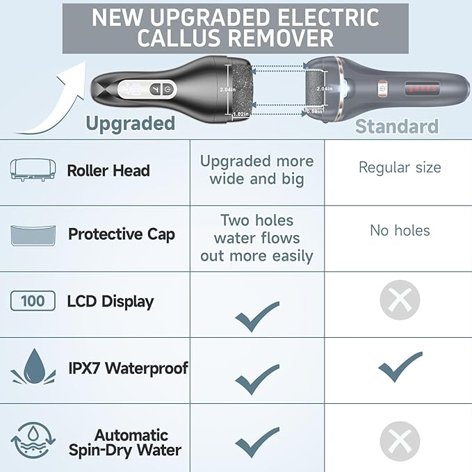 - 🌟【Upgraded Electric Foot Callus Remover,More Powerful,Faster】 ━ New & Improved callus remover for feet giving you 2x more power than other rechargeable brands. See for yourself, when you try it! Charge once and use multiple times, no need to keep it plugged in. It's portable, lightweight, and the perfect, travel-friendly gift set for both men and women.With this foot care tool, you'll say good-bye to cracked heels and hello to your favorite sandals. Pamper your feet with spa-like pedicure in the comfort of your home. Watch years of callused, dry, hard skin give way to baby-soft, smooth skin in minutes.