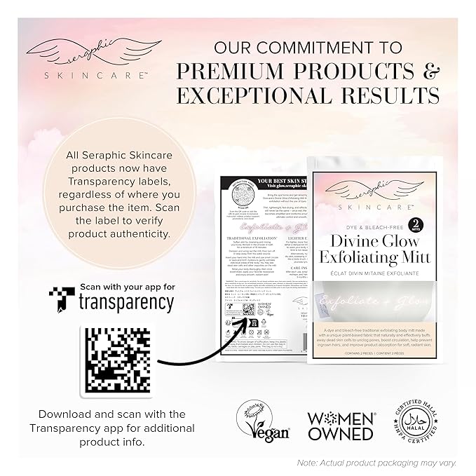 - BETTER THAN LOOFAHS OR CHEMICAL EXFOLIANTS – Loofahs and chemical exfoliants don’t have the skin-gripping power of our Divine Glow exfoliator glove, meaning they’re just not as effective at removing dead skin. Our body mitts are certified vegan and Halal, offering a naturally effective alternative – they’re rough enough to deeply exfoliate while soft enough to buff and smooth. Plus, our product packaging includes step-by-step instructions for customized results!