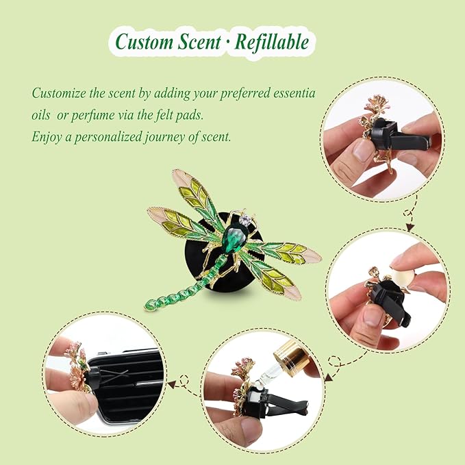 - Thoughtful Gift Idea: Treat yourself or a loved one to the gift of elegance with this green alloy rhinestone dragonfly car vent clip. It's a chic and practical accessory that will impress any car enthusiast or fashion-forward individual.