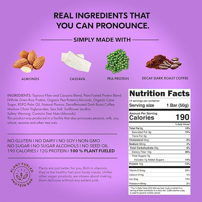 - ENJOY GUILT-FREE INDULGENCE: Fuel your day with the satisfying taste of Whole Lotta Macchiato Protein Bars—made with real ingredients like Almonds, Cassava, and Pea Protein. Each 190-calorie bar packs in 12g of plant-powered protein and 12g of fiber, offering a rich macchiato-inspired treat that supports your energy and keeps cravings at bay. Snack boldly, snack smart.