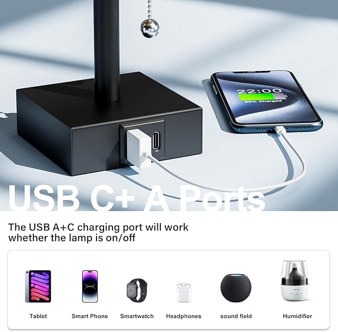- 2. USB A & USB C, Effortless Device Charging - Stay connected whether the desk lamp is on/off and powered up with ease thanks to the side table lamp' built-in charging port, which enable fast and convenient charging for your electronic devices, whether you're winding down with a tablet in hand or need to recharge your smartphone while working at your desk. With instant access to power, your devices are always within reach whenever you need them.