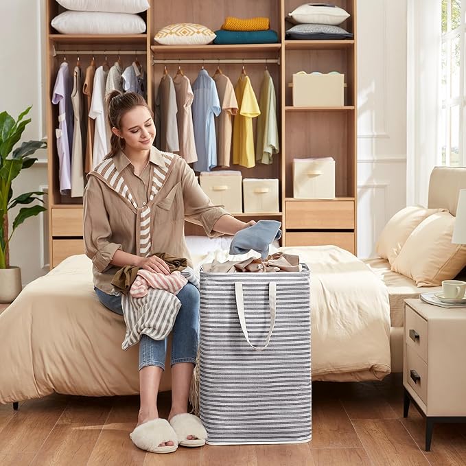 - Collapsible Design: Our laundry hampers for bedroom can be easily folded into 1 piece for a save space storage when not in use. It is ideal for laundry room, bedroom, bathroom, closet and even for college dorms, travel, rv, campers, hotel use and shopping. This hamper comes in folded and will return to its shape by filling it with clothes or ironing it to smooth the creases.