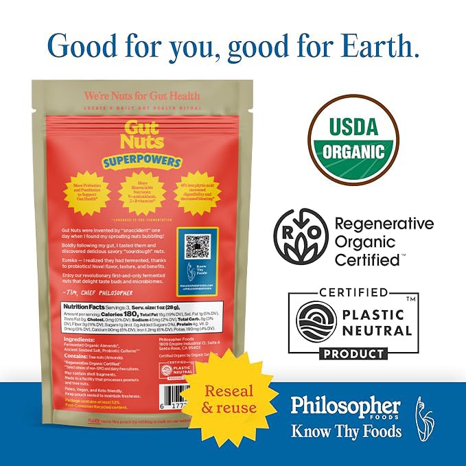 - Philosopher Foods Gut Nuts - Fermented Almonds for Gut Health - Tangy, Umami, & Salty Flavors - Super Crunchy Low Carb Keto Snacks - Low Sugar Prebiotic & Postbiotic Almond Snacks - 3oz Pouch (6 Pack)