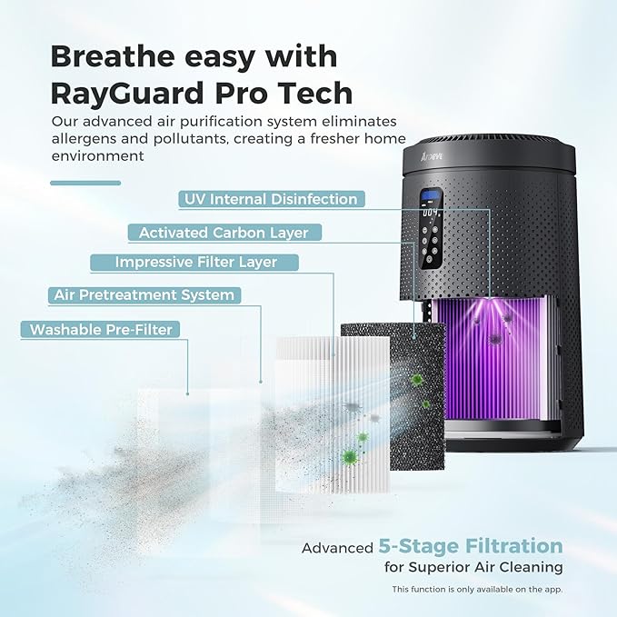 - Advanced Air Purification for Home Large Room: The air purifier features air purification capabilities, boasting a large Clean Air Delivery Rate of 229 CFM, covering up to 1782 sq ft. Its four-layer filtration system includes a washable filter for extended use and incorporates UV functionality (UV is invisible). Additionally, the circular intake design of the 360° filter ensures comprehensive air purification.