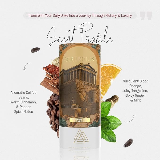 - Aromatherapy for Your Car: Elevate your driving experience to new heights with Acropolis by House of Olympus. Inspired by the ancient grandeur of the Acropolis, this luxurious car air freshener transforms your daily drive into an empowering journey through time. Infuse your vehicle with a fragrance crafted for boldness, invigoration, and timeless sophistication. With every breath, you’ll feel energized and ready to conquer the day.