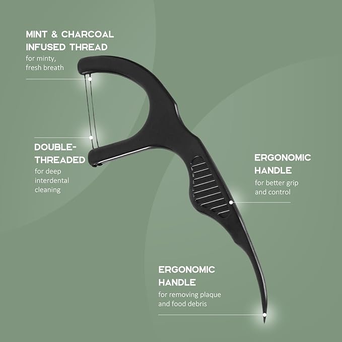 Plant Based Dental Floss Picks (300 Count) - Freshlock EcoPouch, Plant Based, Vegan, Eco Friendly, Sustainable Dental Flossers - Twin Floss (Charcoal)