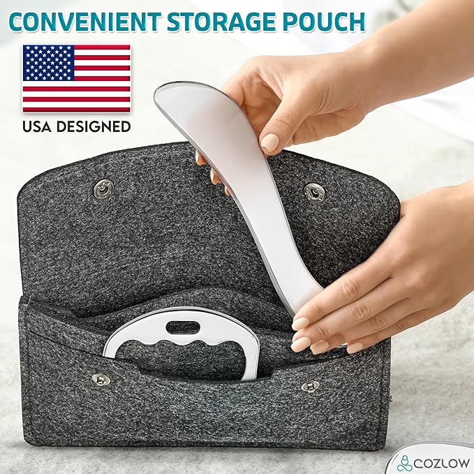 - 2-in-1 COMPLETE SET - Includes 2x IASTM stainless-steel muscle scrapers (D-shaped & S-shaped) and 1x felt carrying bag for portability
