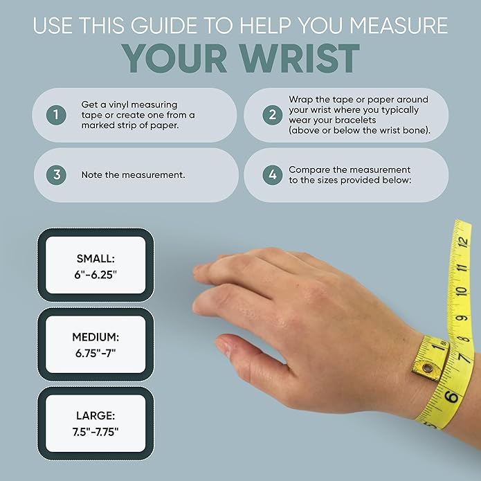 - UNISEX: Three sizes available: Small (6”-6.25”), Medium (6.75”-7”), and Large (7.5”-7.75”). Please measure your wrist at the point you like to wear your bracelets. If between sizes, size up or down depending on if you like your bracelets a little tight or loose. Please see the description below for an easy way to measure your wrist.