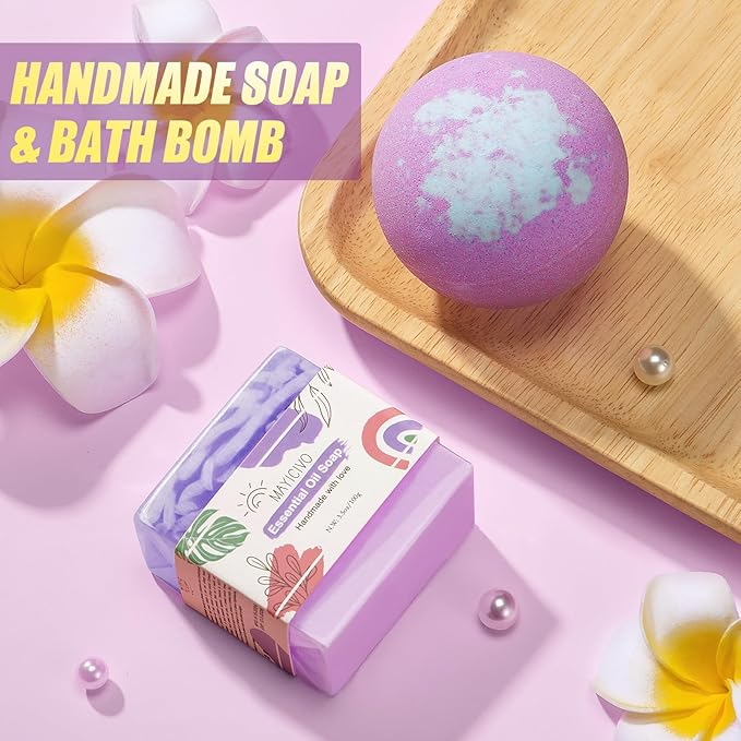 - RELAXING SPA GIFTS BASKET: Made of natural wax, the 6oz scented candle can burn smokelessly & evenly with bluebell scent for up to 40 hours; comes with a handmade soap & an cute bath bomb, both release long-lasting lavender fragrance, will create a calm & peaceful rest atmosphere while bring her a luxurious & sublime bubble bath experience, help soothe her mind & relax body. What a thoughtful relaxation gifts relaxing spa gifts baskets bath set