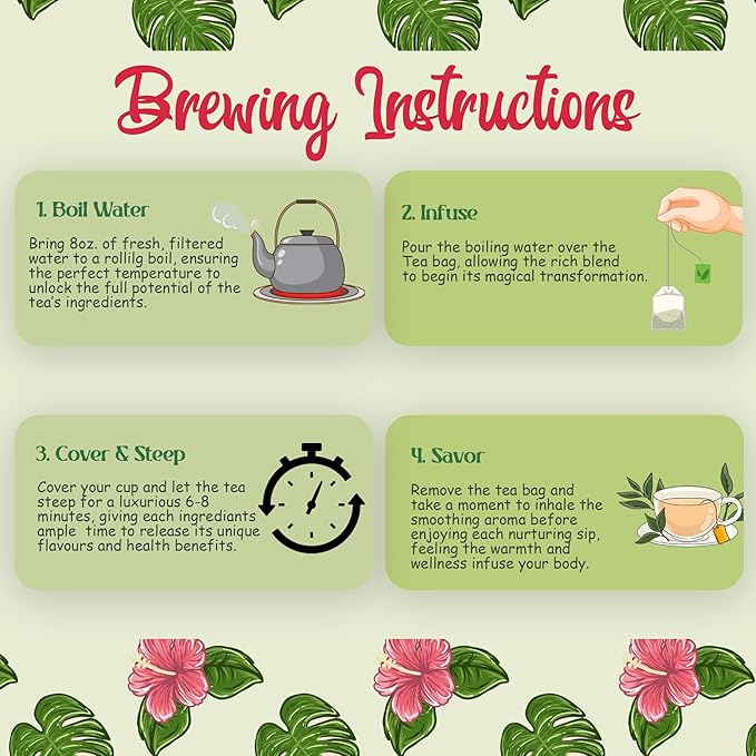 - āšš¬šš š - First Pour 8 oz of freshly boiled water over 1 tea bag of Tropace organic hibiscus tea and then Cover & Steep for 6 - 8 mins to ensure maximum goodness.