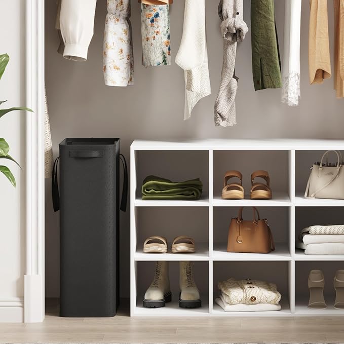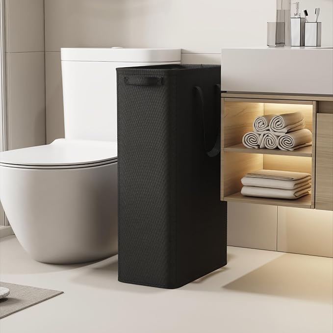 - Thin Design: Measures 16.1"x8.7"x28.4" (41x22x72 cm), this skinny hamper fits tight spaces effortlessly. Ideal between washer and dryer or in small cabinets. Sided handles make moving easy, saving space in your laundry area