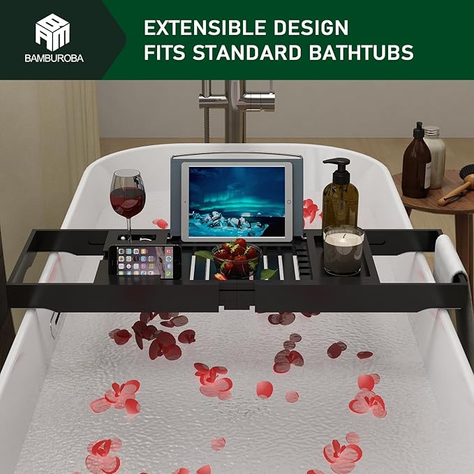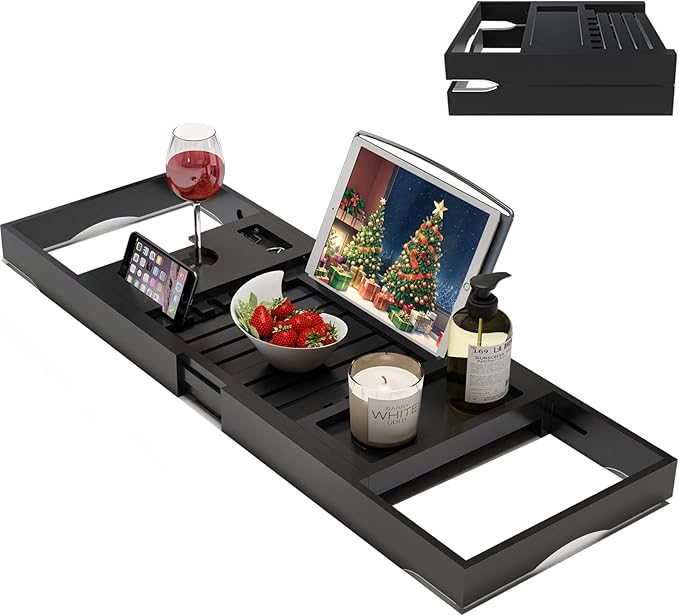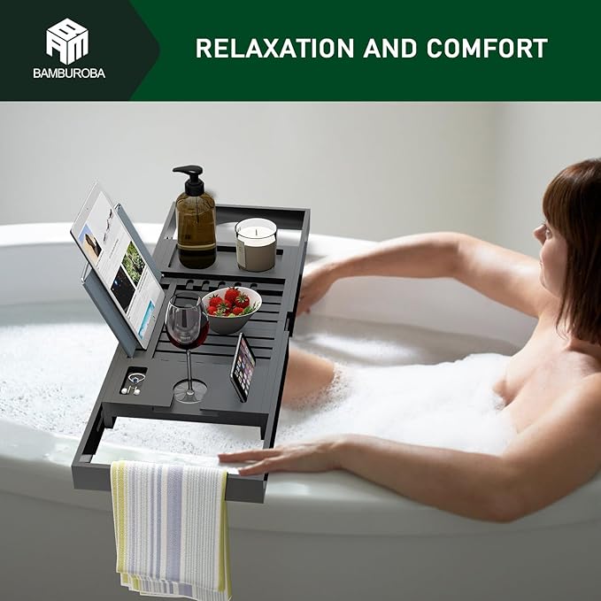- RELAX IN BATH TIME: Create a luxury at-home spa with our beautifully-designed adjustable bath tray for tub. Melt your cares away pampering yourself in a relaxing bath with this tub tray and any bathtub accessory you desire!