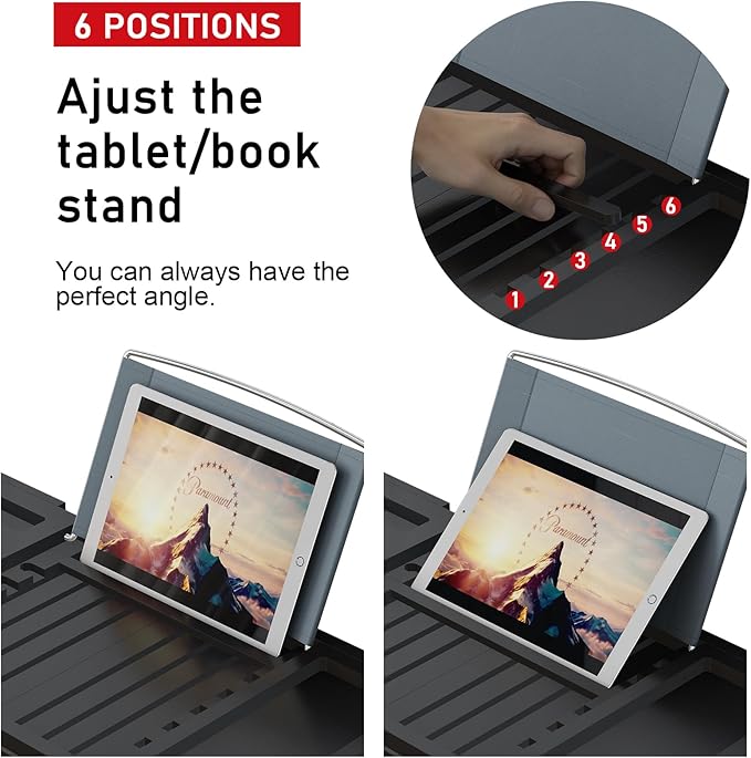 - MULTI-FUNCTIONAL: This bamboo bath tray features 6 reading angles for ideal viewing experience of your book or Ipad, the wine glass holder,cup holder, phone slot and two side-trays are designed for your bath time. Enjoy bubble baths with your essentials within reach.