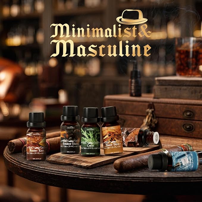 - Refined Gentlemen's Collection: Step into sophistication with this gentlemen essential oil set, featuring Smoked Ebony, Sandalwood, Amber Rum, Cedar, Cologne, and Sweet Tobacco. Each fragrance oil is crafted to highlight masculine charm—perfect for the man who values rich, deep, and timeless scents.