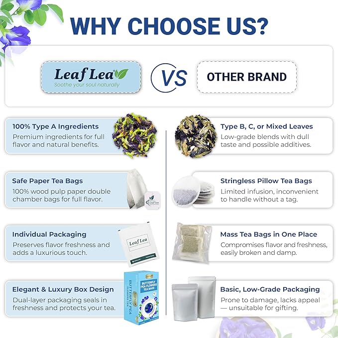 - RICH IN NATURAL NUTRIENTS - Butterfly pea flowers are packed with phytochemicals and essential nutrients, promoting immunity and relaxation. Enjoy LeafLea butterfly pea flower tea for overall well-being and balance.