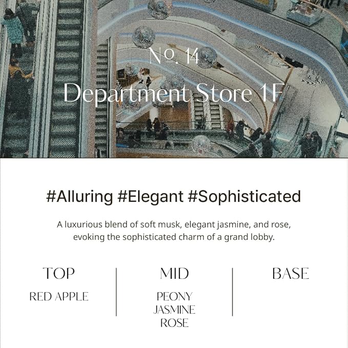 - DEPARTMENT STORE 1F SCENT: Feel the luxury of a high-end shopping experience with the 'Department Store 1F' diffuser. This elegant aroma blends cozy musk with floral notes of jasmine and rose, evoking the sophisticated atmosphere of a department store lobby.