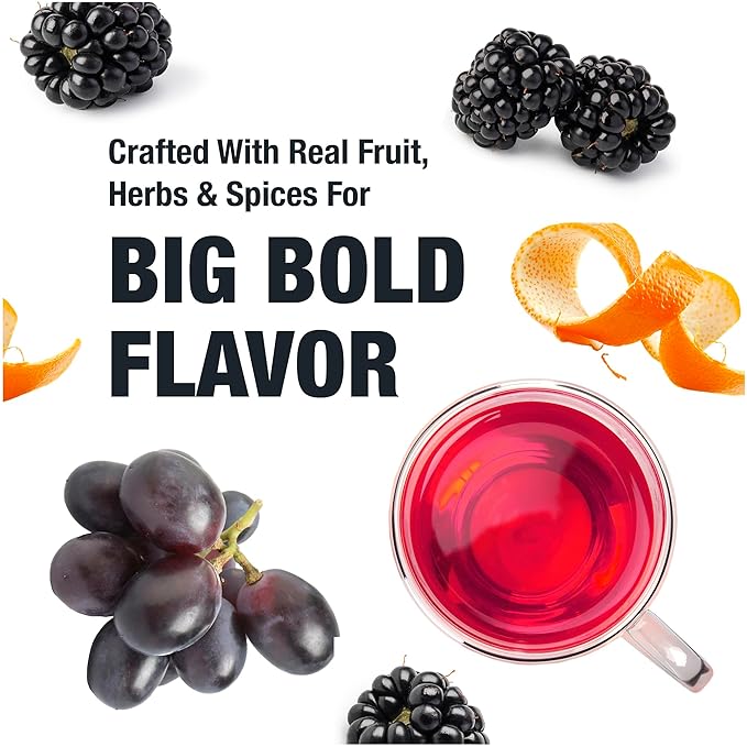 - EXQUISITE BLEND OF NATURAL INGREDIENTS: Our Grape Escape herbal tea is crafted with a carefully selected blend of natural ingredients, including grape, hibiscus, rooibos tea, sweet blackberry leaves, orange peel, cranberry slices, black currants, plum bits, blackberries, red currants, cherries, blue butterfly pea, and vanilla extract. Each ingredient contributes to a delightful tea experience.