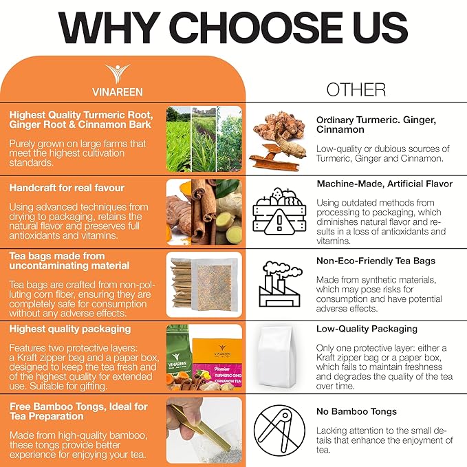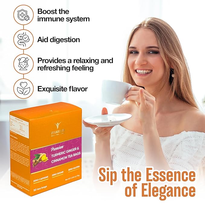 VINAREEN 50 Premium Tea Bags, Special Blend of Turmeric Ginger Cinnamon Tea,100% Natural Turmeric Ginger Herbal Tea, Te De Jengibre Y Curcuma Canela, Caffeine Free, Gluten Free, Sugar Free, Vegan.