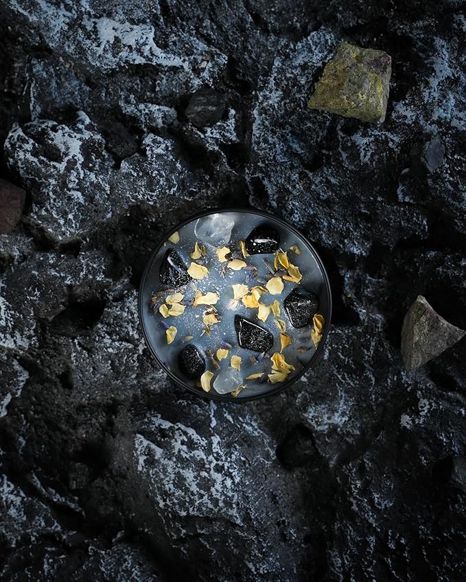 - š 8 oz jar with vegan soy and coconut wax, crystals cleansed with sacred wood, with natural dried flowers.