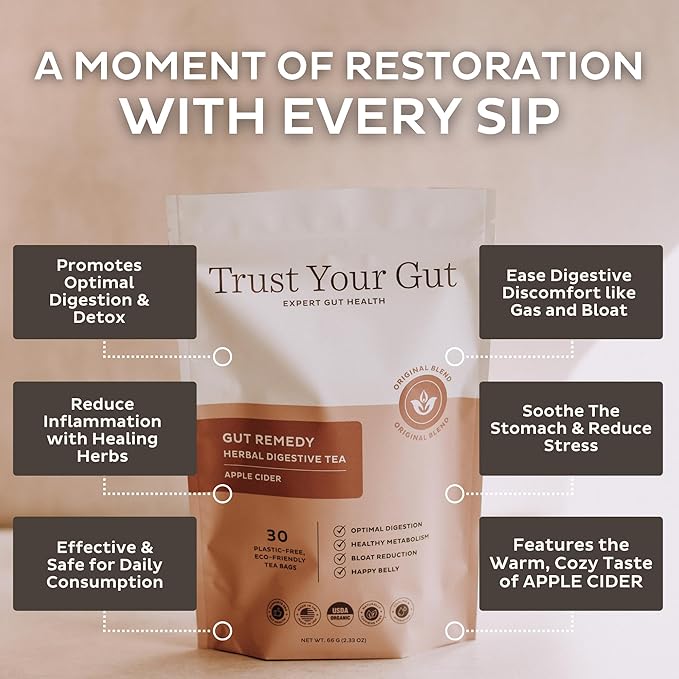 Trust Your Gut Organic Herbal Tea Blend with Lemon Balm, Holy Basil, Dandelion, Ginger Root – Liver Detox, Digestion & Gut Health Support, Gas Bloating Relief – Apple Cider, 30 Bags