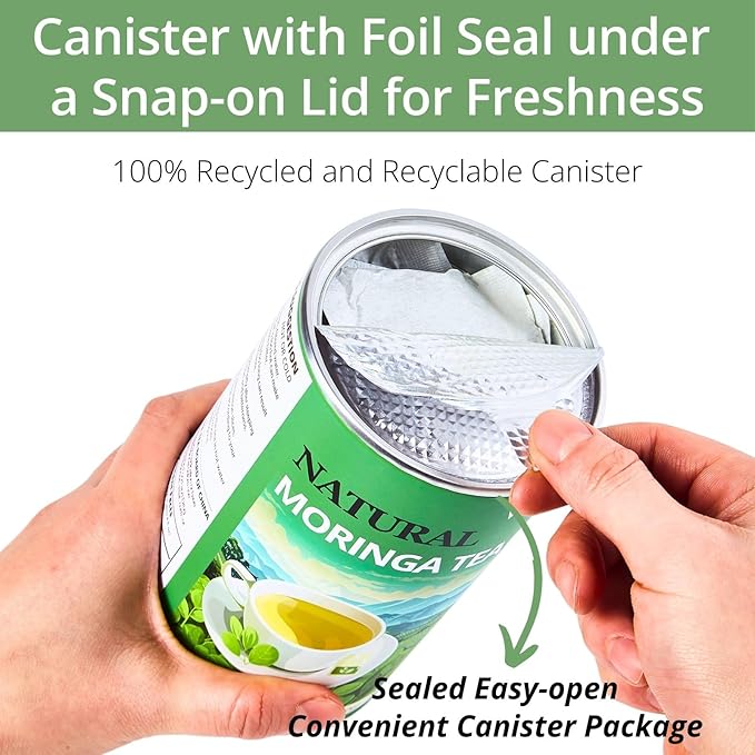 - [ Eco-Conscious Tea Bags & Canister ]- Our best morimga tea bags are made from paper, they contain no strings, wrapping, staples, adhesive, bleach, or dyes. Enjoy pure, high-quality moringa leaf in biodegradable bags. And special convenient canister with lid. There is a foil protective seal under the lid - easy to remove and useful to keep the miringa tea fresh