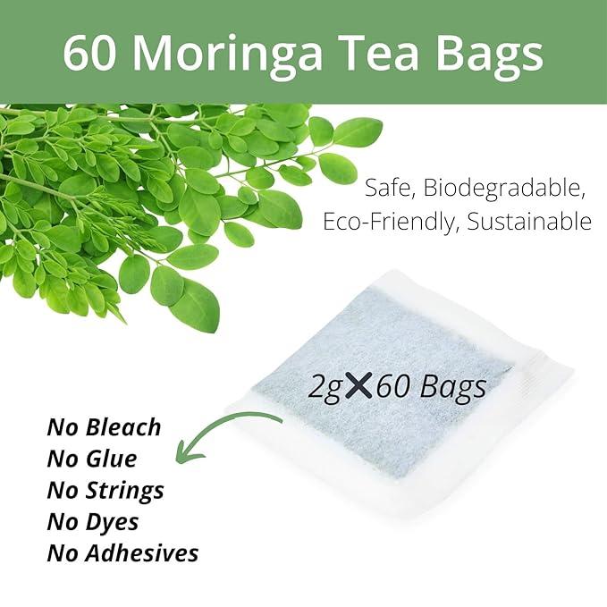 60 Natural Moringa Tea Bags, VitalForest Pure Moringa Leaves Te De Herb, Supports Digestion and Wellness, Caffeine-Free