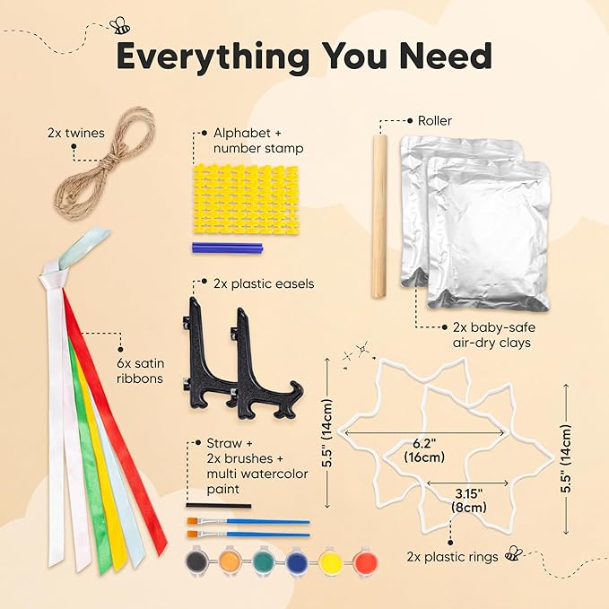 - All-Inclusive Kit - Our Trove Baby Handprint Ornament Kit for babies offer 2 baby-safe airdry clay, 2 shaped rings, acrylic paints, 2 paint brushes, 6 satin ribbons, 2 twig strings and alphabet stamps. DIY personalized newborn gifts for your babies!