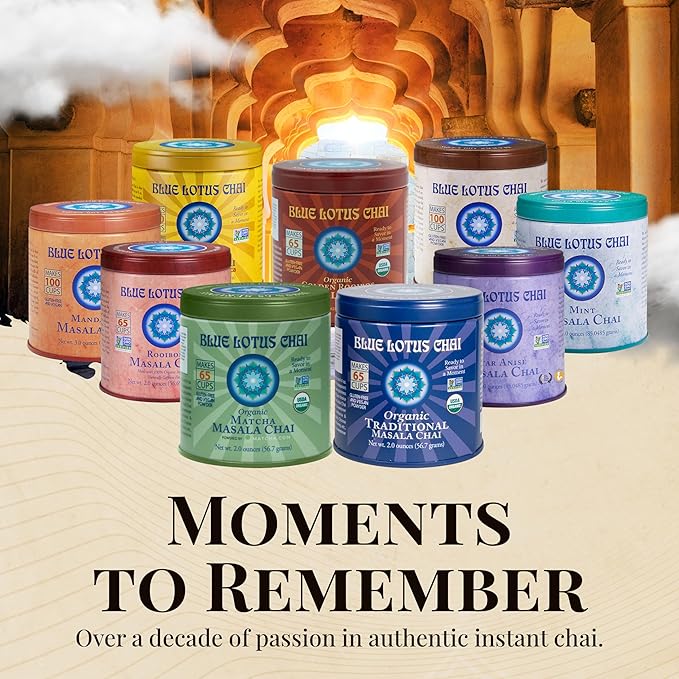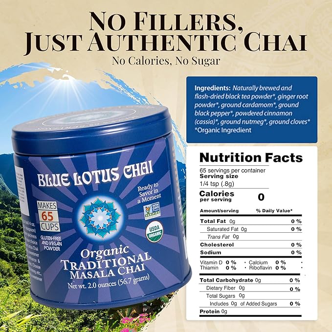 - 65 CUPS OF FAST, AUTHENTIC AND DELICIOUS CHAI IN EVERY TIN - Described by some as the perfect chai powder, Blue Lotus Chai is ready in seconds - just add hot water, milk and your favorite sweetener and enjoy! You'll be blown away by the amount of flavor packed into each 1/4 tsp serving.