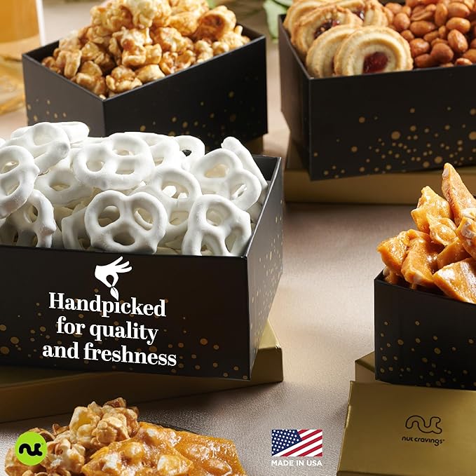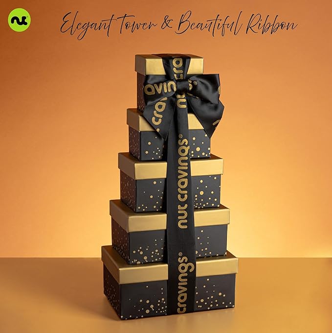 NUT CRAVINGS - Diwali Sweets Hamper Chocolate Covered Pretzels & Caramel Popcorn Gift Basket, in Black Tower + Ribbon (8 Assortments) Food Arrangement Healthy Snack Care Package