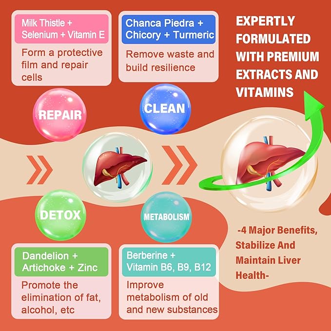 - 💯👍 Made in USA & Worry-Free After-Sales Service: Our liver support gummies are manufactured and tested in the USA in a GMP-certified facility. We prioritize quality and safety, ensuring every bottle meets the highest standards. Free from GMOs, preservatives, artificial colors, and harmful additives, these gummies are vegan, gluten-free, and sugar-free. Your satisfaction is our top priority—contact us with any questions, and we’ll be happy to assist you.