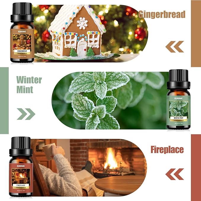 - Christmas Preparation Must-Have: This set is a delightful assortment of wintery scents, from the enticing allure of Gingerbread Scent to the clean, crisp essence of Forest Pine Scent, and the sweet, warm, woodsy base of Fireplace Scent. Infuse your space with these lovely scented oils; Adds a touch of sophistication to any place or time, reminding you of wintertime vibes and cozy festive smells