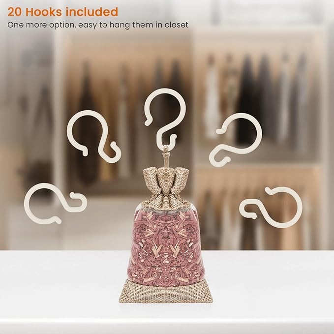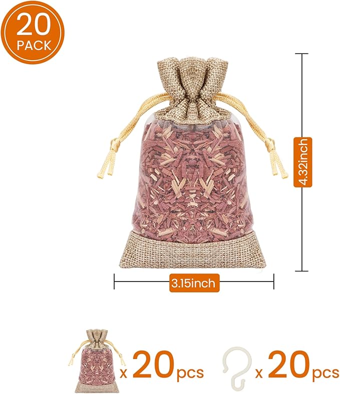 - VERSATILE & CONVENIENT: Cedar closet value pack with 20 cedar satchels and 20 Hanging Closet Hooks; These cedar sachets packets are easily hung in your closet or wardrobe, or placed in drawers, garment bags, cabinets, lockers, cars, shoes or anywhere in your home!