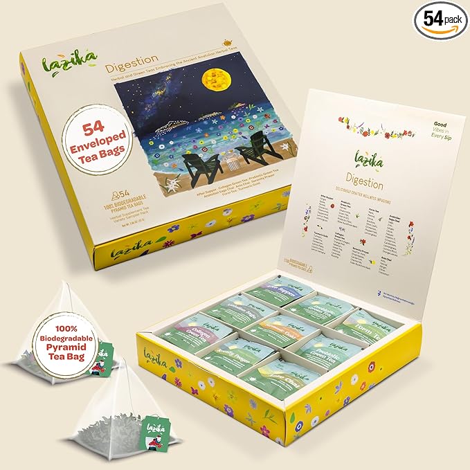 Lazika Herbal Tea Variety Pack with Lovely Presentation Box, 54 Counts Digestion Tea Assortment Gift Set, Premium Collection with Pyramid Infuser Bag, Handcrafted