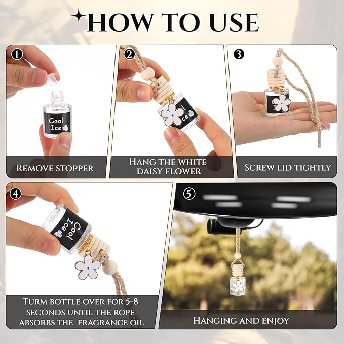 - What You Will Receive: you will get 2 hanging car aromatherapy and 2 white daisy ornaments. first, remove stopper; second, hang the white daisy flower; third, screw lid tightly; and then turn bottle over for 5-8 seconds until the rope absorbs the fragrance oil; finally, hanging and enjoy