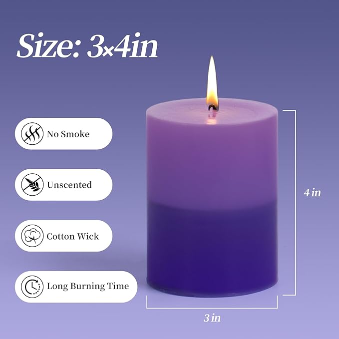 KONNI Purple Layered Pillar Candles Set of 3, 3"x 4" Unscented Pillar Candles Bulk, 39 Hours Long Burning Candles, Smokeless&Dripless Large Round Candle for Wedding, Home Decoration, Parties, Dinner