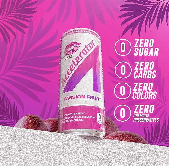 - Contains: twelve 12 fluid ounce cans of Accelerator Active Energy Drink, Passion Fruit Tunde flavor; Bursts of passion fruit deliver a perfect balance of sweet & tangy in this exclusive flavor created by fitness icon Tunde Oyeneyin to Accelerate Your Day. Accelerator sugar free energy drinks for sustained clean energy that accelerates metabolism and enhances focus