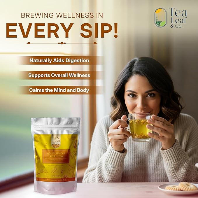 - ✔️ Tea Leaf & Co. Honey Lemon Green Tea: A premium blend of green tea, honey extract, licorice, lemon flavor, chamomile, and lemongrass in 100 pyramid tea bags. Take advantage of a low-caffeine cup of tea that will delight your senses and make you feel refreshed.