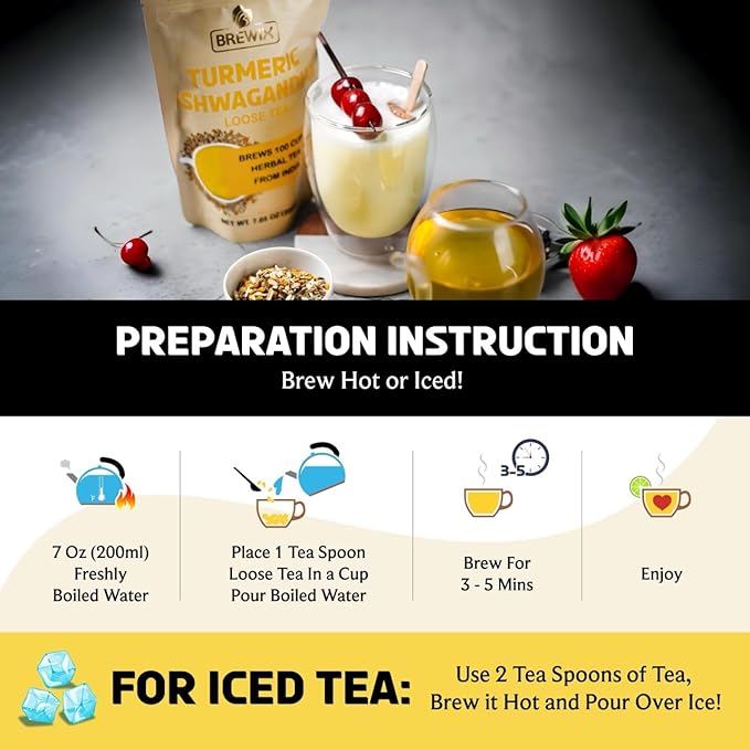 BREWIX, Turmeric Ashwagandha Herbal Tea Loose Leaf (100+ Cups, 7.05oz/200g) Real Ingredients From India, Caffeine Free & Naturally Gluten Free