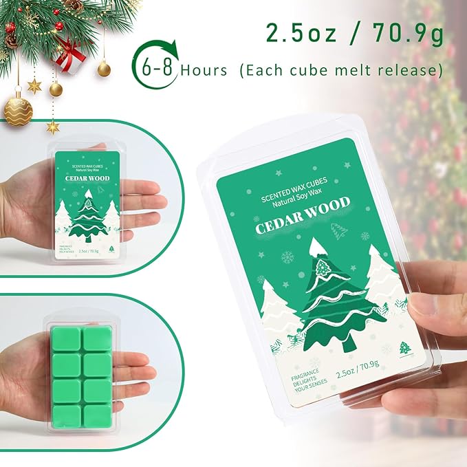 - CHRISTMAS SCENT: A cozy, rich seasonal mix of 4 flavors scented soy wax melts, including Christmas scents including Cedar Wood, Ginger Bread, Vanilla Cake, Apple & Cinnamon. (2.5 ounces each)