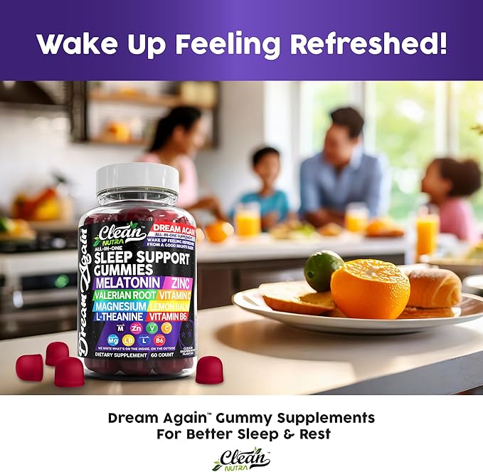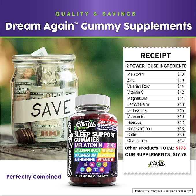 - Sleep Gummies with L Theanine: Unlock the power of sleep with melatonin 20mg, organic valerian root, magnesium oxide, organic lemon balm, theanine powder, vitamin B6 100mg, hibiscus flowers, and vitamin a beta carotene. Ease your mind and regulate your sleep with aided benefits of saffron supplement, chamomile capsules, vitamin C and zinc. With added vitamins and herbs like vitamin C gummies for adults, zinc supplement, and vitamin B6 50mg, Dream Again creates the perfect foundation for sleep supplements.