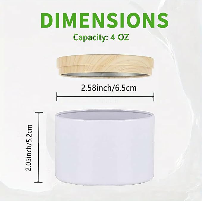 - 【Large Dimension & Capacity】: Dimensions: 2.58" (Diameter) x 2.05" (Height) white round metal candle tin. Capacity: 4 oz =1cup=118 ml. One pack includes 24pcs 4oz white empty candle jars and 24pcs wood-grain lids.