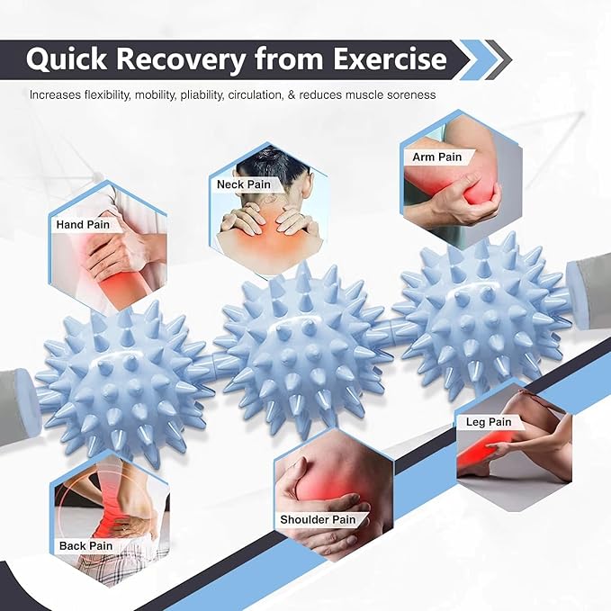 - ā 3 MASSAGE BALLS FOR BODY RELAX: Spike nodules balls provide deep tissue massage with acupoints stimulation to promote blood circulation and help reduce muscle pain, soreness, pain and nodules. Used at least once daily for around 5 to 10 minutes per each target skin area, helps loosen muscles before and after workouts to reduce risk of injury