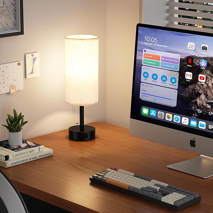 - Bedside Lamp with Practical AC Outlet - This modern bedroom lamp provides a convenient AC outlet that eliminates the need for additional power outlets, simplifies desktop wiring, and keeps your desk tidy. The two-pin plug is always available for connection to other devices, such as your cell phones, tablets, laptops, humidifiers, smart watch and more, regardless of whether the matching bed lamp is on or off. This compact night lamp is ideal for small office or study environments